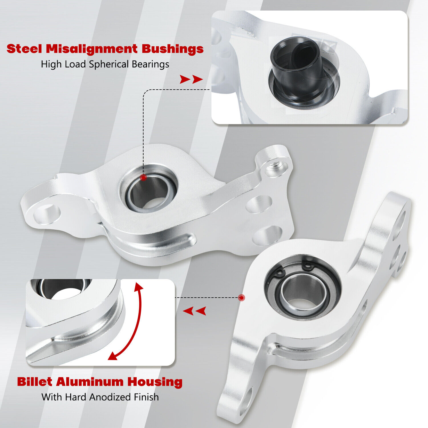 For maximum suspension performance, Billet Compliance Brackets w/ Spherical Bearings are best complemented with Spherical Bearing Front Lower Control Arms, Pro Series Camber Kits, Coilovers, and Strut Tower Bars. Front Compliance Bracket; Billet Aluminum Housing w/Spherical Compliance Bearings.